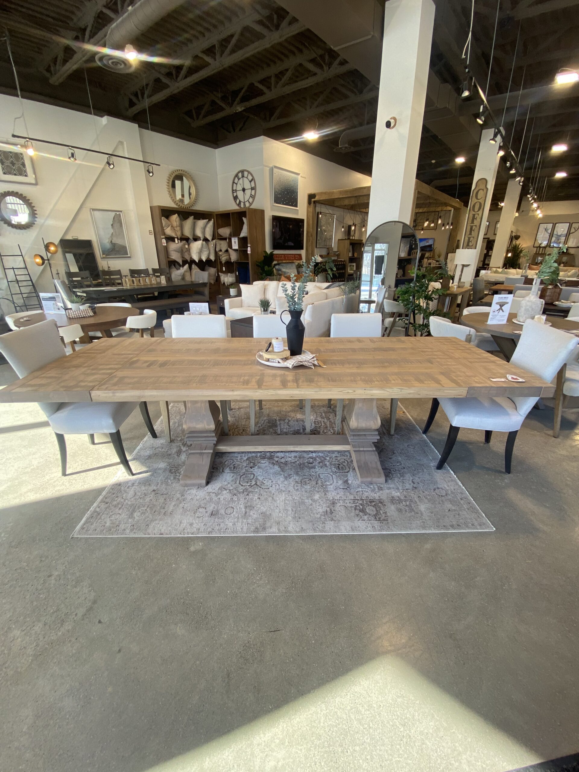 Canadian made, solid wood dining table with double pedestal base.